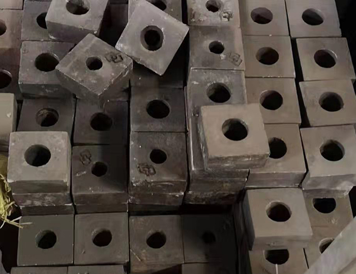 制砂机冲击块 物料由进料斗进入制砂机,经分料器将物料分成两部分,一部分由分料器中间进入高速旋转的叶轮中,在叶轮内被迅速加速,其加速度可达数百倍重力加速度,然后以60-70米/秒的速度从叶轮三个均布的流道内抛射出去,首先同由分料器四周自收落下的一部分物料冲击破碎,然后一起冲击到涡支腔内物料衬层上,被物料衬层反弹,斜向上冲击到涡动腔的顶部,又改变其运动方向,偏转向下运动,从叶轮流道发射出来的物料形成连续的物料幕。